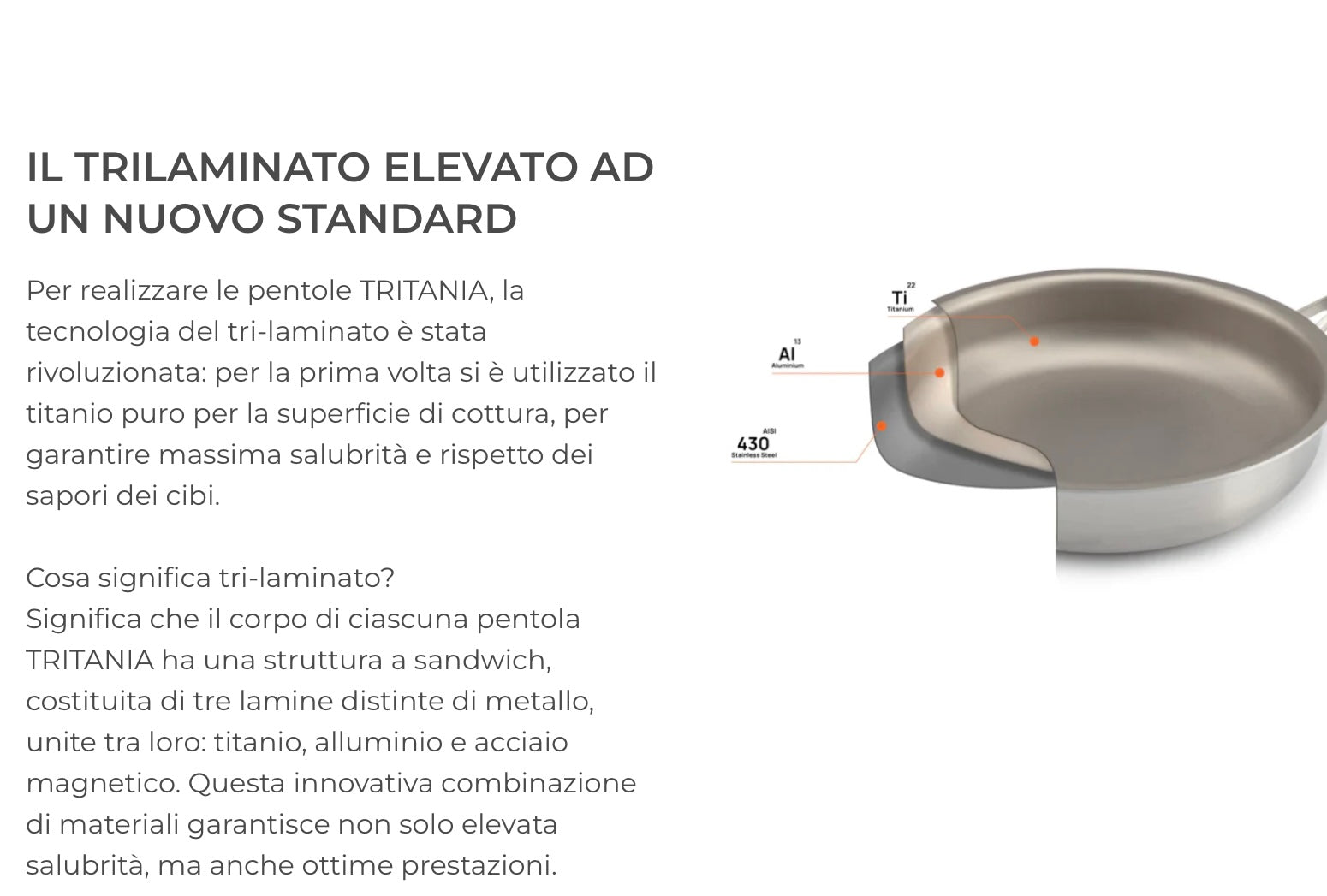 Struttura a corpo unico in multistrato: titanio puro a contatto con il cibo, alluminio all’interno ed acciaio inox all’esterno